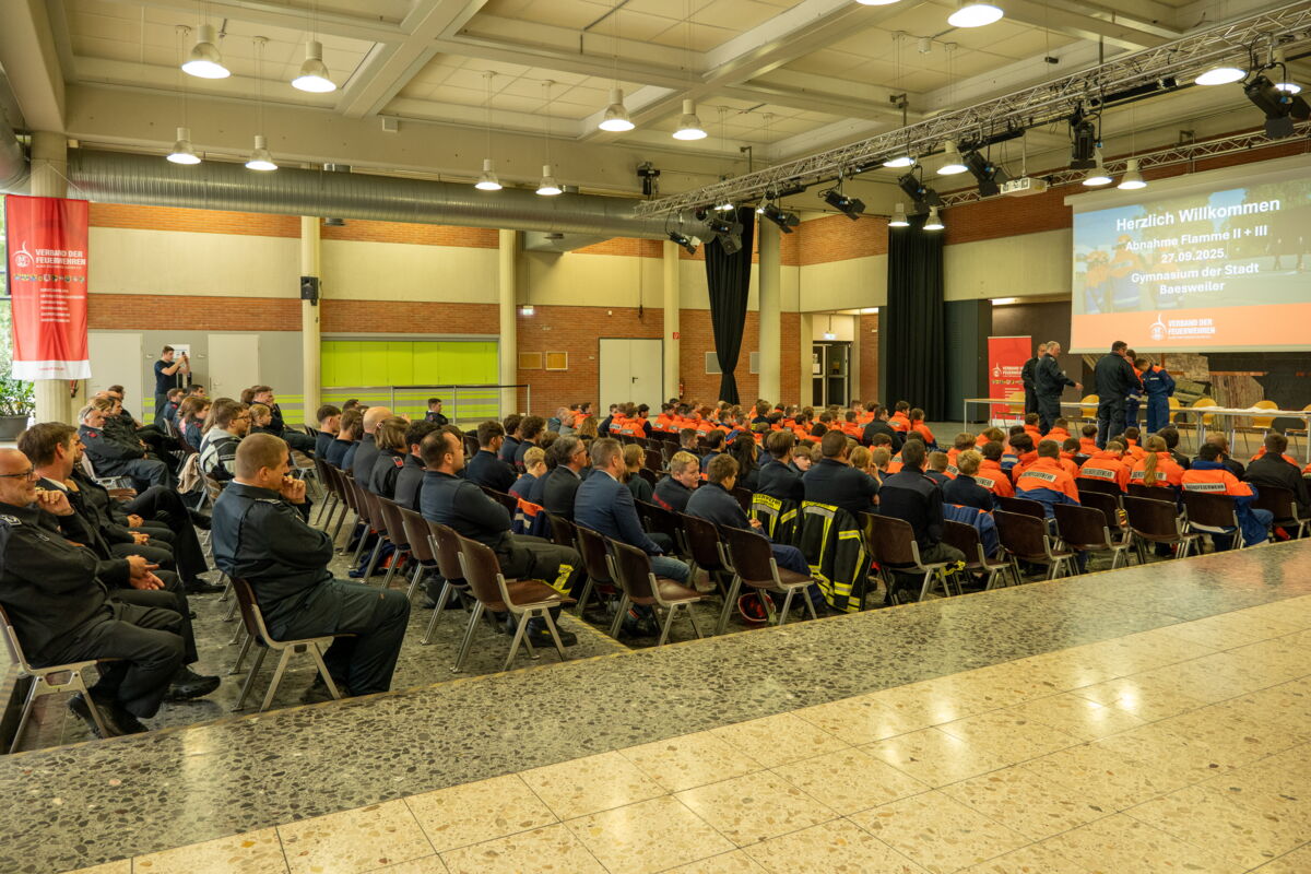 Vor dem Beginn des Kreisjugendfeuerwehrtages wurde die Jugendflamme der Stufe 2 und 3 abgenommen. Dafür haben sich ca. 100 junge Feuerwehrkameradinnen und -kameraden inklusive ihren Ausbilderinnen und Ausbildern und den Betreuerinnen und Betreuern aus den Städten Baesweiler, Eschweiler, Herzogenrath, Stolberg und Würselen zusammengefunden. Mit der Jugendflamme wird nicht nur feuerwehrtechnisches Fachwissen abgefragt, sondern auch das Allgemeinwissen. Außerdem wurde die Teamfähigkeit getestet.